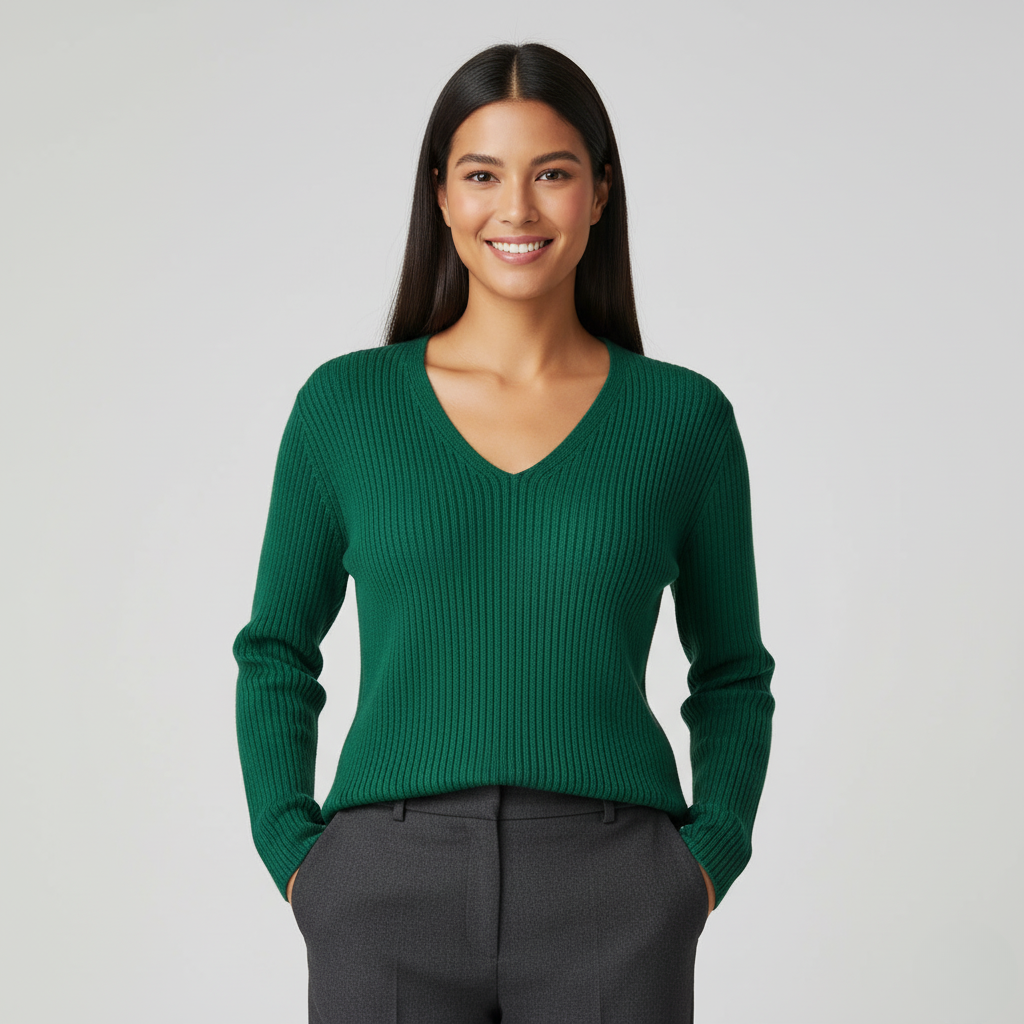 A streamlined layer created for women who want a dependable piece that fits naturally into daily wear. This women’s sweater features a simple V-neck profile and a subtle ribbed structure, offering a balanced look that pairs smoothly with a wide range of outfits within the women’s fashion niche.
