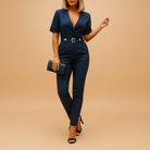 This women’s jumpsuit features a tailored silhouette with a V-neckline, collar, and half sleeves, creating a refined and balanced look. The structured shape makes it suitable for both professional and festive occasions. Its timeless design allows versatile styling with accessories or footwear. Available in various classic shades, it complements a wide range of outfits.