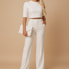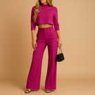This women’s set features a fitted silhouette with a cropped top and matching trousers, designed for the cooler autumn season. The elastic waistband offers an adjustable fit suitable for everyday wear. Its simple and modern design makes it easy to style for work, leisure, or casual outings. Available in various shades, it can be combined with different wardrobe essentials. Suitable for seasonal use.