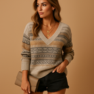 This women’s jumper features a relaxed V-neckline and a refined knitted texture, creating a balanced and versatile look for daily wear. The simple design makes it suitable for casual outfits, workdays, or layered winter styles. Its soft structure provides comfort across all seasons, pairing easily with jeans, skirts, or tailored trousers. Available in various neutral tones and subtle prints.