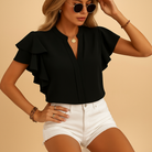 Add a touch of elegance to your wardrobe with this stylish V-neck blouse featuring layered ruffle sleeves. The refined neckline and structured silhouette create a polished look, while the lightweight construction offers ease of movement for all-day wear. Perfect for both work and casual occasions, this blouse pairs effortlessly with trousers, skirts, or shorts for a timeless and versatile outfit.
